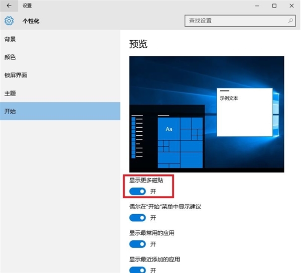 默认情况下开始菜单磁贴组中包含三列中等尺寸的磁贴,但是有用户反馈他们需要能够容纳4列磁贴,这样就能够让两个宽尺寸磁贴并排显示在磁贴组中。现在可以在设置-个性化-开始中来开启“显示更多磁贴”。另外,新版本开始菜单支持磁贴总数从原来的512个增加到2048个。