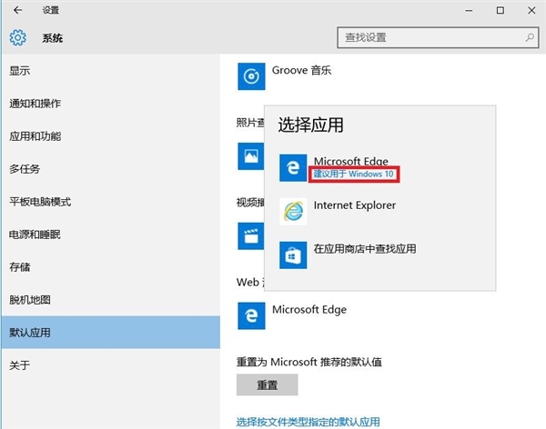 现在切换默认程序,如果是改变Windows 10内置的官方应用,应用名称下方会提示出“建议用于Windows 10”,如下图: