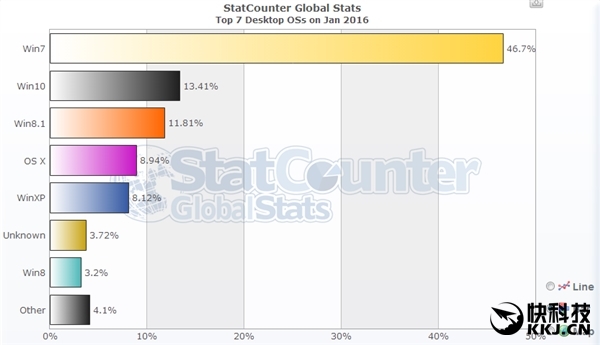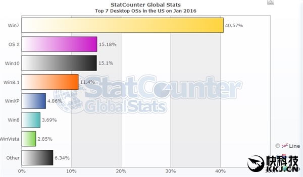 当然不同国家的情况差别很大,在美国Windows 10、Mac OS X几乎是并驾齐驱,都在15%之上,Windows 7刚刚超过40%。