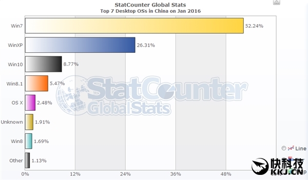 而在中国,Windows 7依然高达52.24%,位列第二的是Windows XP 26.31%,Windows 10才不过8.77%。