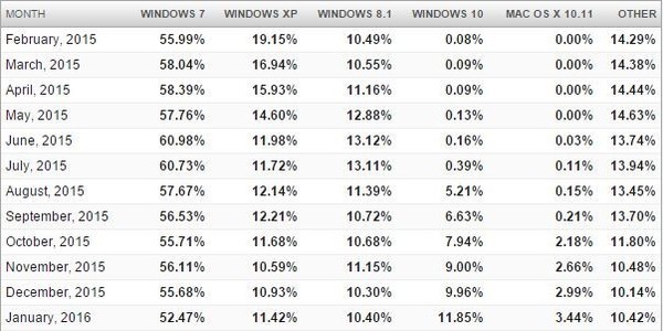 根据市场调查机构Net Applications公布的最新调查数据,Win10在2016年1月的市场占比中攀升了1.89%,增长速度非常快,而上月也是Win10发布以来Win10份额增幅最大的一个月。和上月的9.96%相比,Win10增长了1.89%的份额达到了11.85%的占有率,超越了WinXP 11.42%的份额!而现在份额最大的操作系统依然是Win7,在PC市场占据了52.47%的份额,Win10目前距离Win7还比较遥远。
