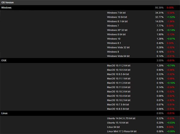 那么Win7有没有在某些领域,特别特别地接近Win7呢?还是有的,那就是游戏这一块领域!根据著名游戏平台Steam的数据,64位的Win10现为该平台的第二大操作系统,所占比例为32.77%;位居第一的是64位Win7,份额是34.31%。在游戏玩家群体中,Win10的确很受欢迎,这主要是由于Win10支持DirectX12,一些新游戏只兼容Win10。