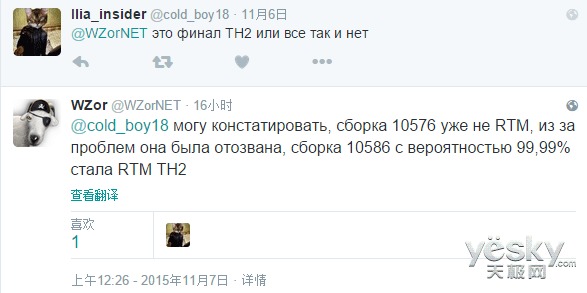 俄罗斯知名爆料人WZor在Twitter上回答网友提问时也表示,Win10预览版10586几乎可以认定为TH2正式版,可能性达到“4个9”:99.99%。这无疑又给10586的正统身份提供了佐证。