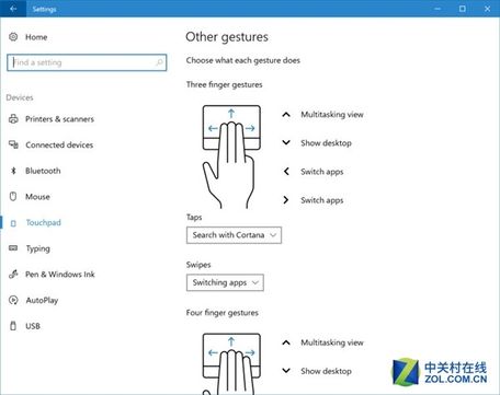 在Build 14946中,用户可以针对三根或四根手指的基本滑动手势进行设置,同时还加入了更高程度自定义手势的“高级手势配置”选项。