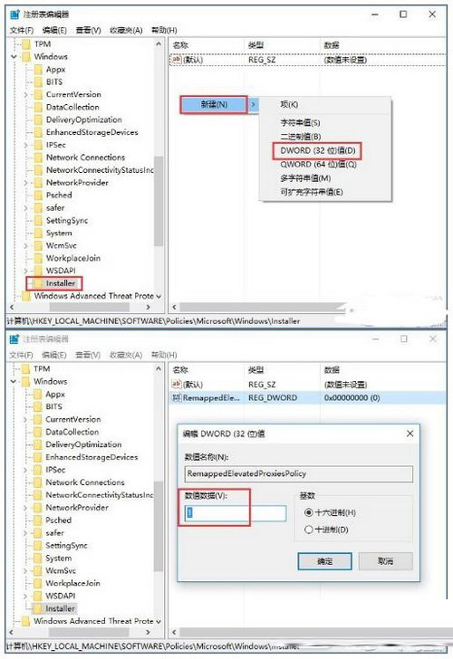 3、在右侧单击右键,选择【新建】-【Dword值】,命名为"RemappedElevatedProxiesPolicy",双击打开将数值数据修改为1;