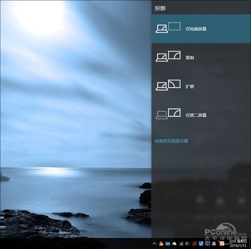 如果你想将画面投影到副显示器或投影仪上,最好的方法就是按一下快捷键Win+P。按下这个键后,系统会马上在右窗格弹出一个投影菜单,只要根据需要直接选择即可。此外如果你有无线显示器,也可以借助这个功能投射,使用起来非常方便。