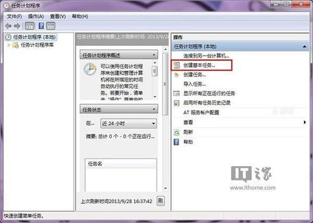 2、在打开的"任务计划程序"中,在右边的操作列表中,点击打开"创建基本任务"。