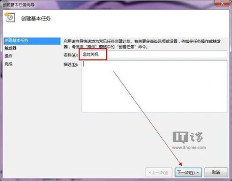 3、在创建基本任务向导对话框里,创建基本任务,输入任务名称、描述,然后点击下一步。本例中,将该任务命名为:定时关机。