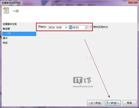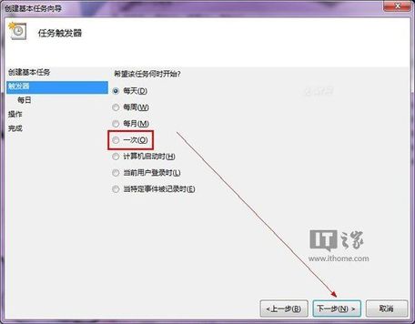 4、在任务触发器步骤中,选择任务触发机制:就像闹钟一样,你自己可以选择定时关机任务是每天按点启动,还是每周按点启动,或者是就执行这一次。本例选择了"一次",就是说,定时关机任务执行一次关机后,任务就失效。
