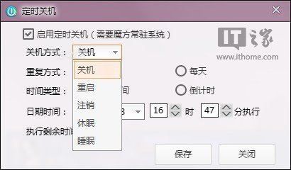 3、在魔方中,设置定时关机时,你可以按照需要的重复方式、时间类型进行选择。如单次执行、重复执行、倒计时50分钟后自动关机等。