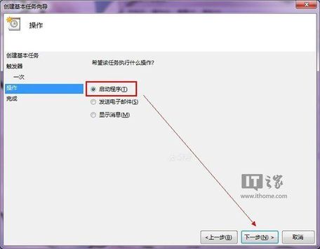 6、设置好时间后,就需要开始选择任务执行的动作。因为我们需要的是定时关机,所以在这里我们需要选择"启动程序"。如果你想让电脑定时发邮件,或者定时显示消息,就可以分别选择其余两项。