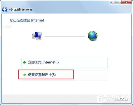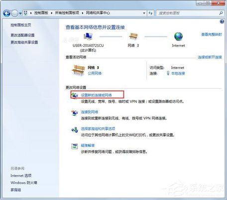2、在网络和共享中心中选择"设置新的连接或网络"。