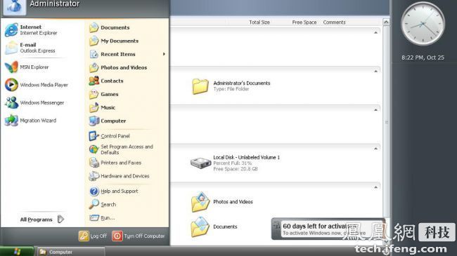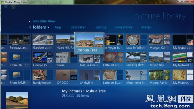 在电视上运行的Media Center界面。微软开发了2个特殊版本的XP,其中Tablet PC更知名,Windows XP Media Center Edition发布时间是2002年,但只有购买高端家庭影院PC的用户才能用上这个版本。