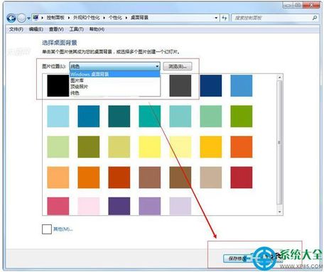10、进入选择桌面背景,在图片位置的右侧,打开下拉框,选择"Windows桌面背景"这一项,如果不想默认,可以按"浏览",设置自已喜欢的背景,设置完成后,按"保存修改"。
