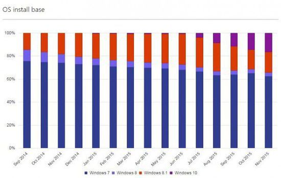 摘要:微软Windows Trends官方数据表明,Windows 10攻城拔地的速度正前所未有地高,普及率超越诸多前辈版本(包括Windows 7在内),是有史以来公司发布的最成功的操作系统版本。2015年11月,Windows 7占有市场63%的比例,而发布仅有数月的Windows 10达到了16%,但是被替代得更厉害的似乎并不是Windows 7,而是Windows 8.1,前者仅有大概个位数百分比的下降,而基于8.1的升级却非常积极。