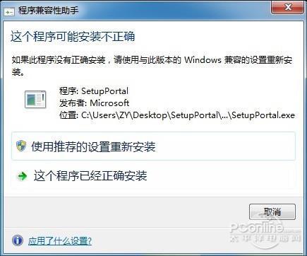 除了UAC以外,Vista引入的另一项人性化机制就是“程序兼容性助手”。当一款软件未成功安装或者经系统判断可能导致一些问题时,操作系统就会“很贴心”地弹出这样一条提示。