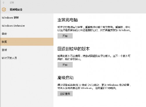 如果要是觉得实在是不好用,你也可以选择“滚”回去,方法也很简单,由于大量用户是从Win7/Win8.1升级而来,因此微软为这部分用户提供了更加人性化的降级选项,具体步骤为:打开开始菜单-选择设置-更新与恢复-恢复-高级启动-回到以前的版本。但是之前Win7/Win8.1保留的系统文件夹Windows.old绝对不能删除。(老编是测试用户,上图可能和你的实际情况不一样,操作步骤是一样的)