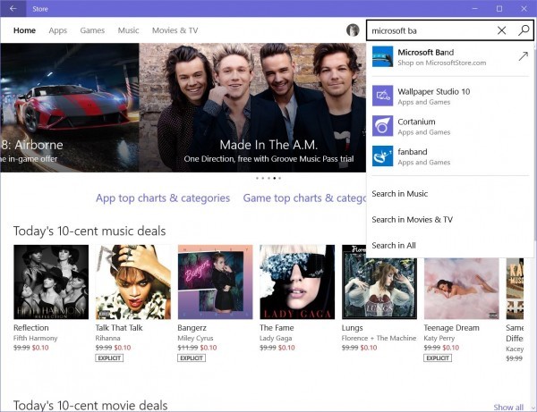 微软更新Windows 10当中Windows应用商店,为其添加了音乐,电影和电视剧分类之后,现在,微软再度更新Windows应用商店,允许用户从桌面搜索框当中查找诸如Surface Book、Surface tablets和微软Band等硬件产品,从而使用户更容易获得微软硬件产品资讯,并且进行购买。