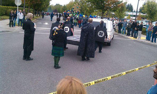 可笑的是,在Windows Phone 7推出之际,微软的Windows Phone团队为iPhone和黑莓(Android不知为何幸免于难)举行了一场虚拟的“葬礼”,一帮人穿着奇装异服在路上游行,甚至还为iPhone准备好了“棺木”和灵车,贴出了“Windows Phone 7 OS Platform Buries the Competition(Windows Phone 7平台将竞争者埋葬)”的海报。当然,现实的情况似乎刚好相反,现在Windows Phone虽然还没被“埋葬”,但也被“埋没”在茫茫机海中。