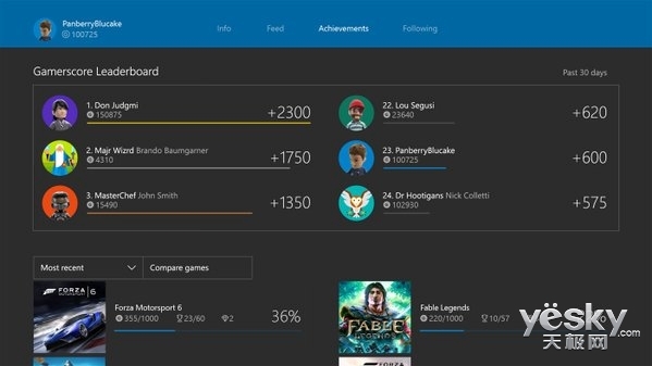 在登录→查看成就中,可查看再次启用的玩家分数排行榜(Gamerscore Leaderboard),提供你和好友的分数情况,告诉你最近30天内谁收获最大;