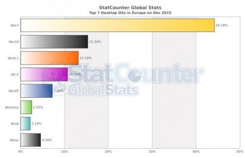 不过现在,StatCounter的数据表明,在欧洲,Windows 7的份额已经下滑到了44.18%,而Windows 10则上升到了第二名(15.34%)。