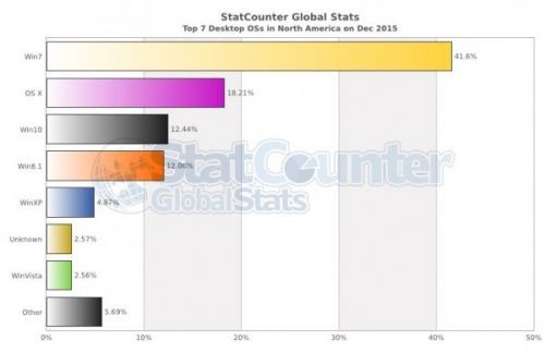 在北美市场,Windows 7失去的用户数还要更多(目前为41.6%),但Windows 10(12.44%)距离第二名的Mac OS X(18.21%)还有一段距离。