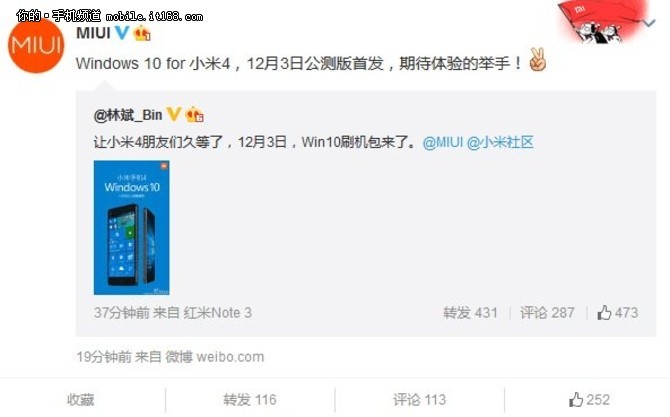 11月30日,小米副总裁林斌在微博发布消息称,小米4用户将在12月3日迎来该机的Win10刷机包。值得一提的是,MIUI官方微博也在随后转发并 评论了林斌的这条微博,并再次确认了Win10 Mobile小米4公测包12月3日发布的消息。毫无疑问,届时小米4用户将能享受到Android(MIUI)与Win10 Mobile的双重体验。