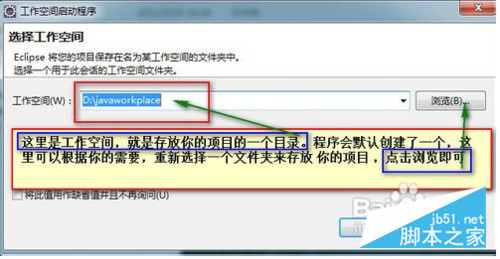 4.启动过程中程序会显示一个工作空间的对话框,工作空间用来存放你的项目文件,你可以使用程序默认的,点击确定即可,你也可以重新选择一个文件夹来存放你的文件,那点击浏览,重新指定你的项目文件存放的目录: