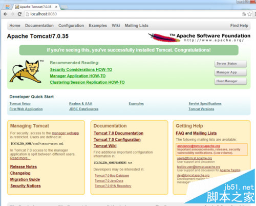 打开浏览器,在地址栏中输入http://localhost:8080回车,如果看到Tomcat自带的一个JSP页面,说明你的Tomcat已搭建成功。
