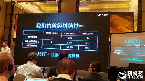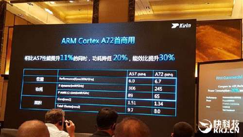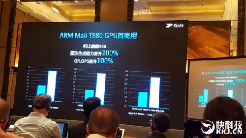 华为表示,ARM Cortex A72核心相比A57提升11%,功耗降低20%,能效比综合提升30%。Mali T880比上一代,图形生成能力提升100%,GFLOPS提升100%。