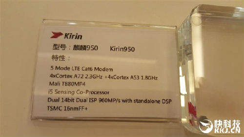 麒麟950是业内首次商用台积电16nm FinFET plus工艺的SOC芯片,相比20nm工艺性能提升40%、功耗节省60%。同时也是首次采用A72大四核2.3GHz+A53小四核1.8GHz的big.LITTLE架构设计以及全新一代Mali T880 MP4 GPU。