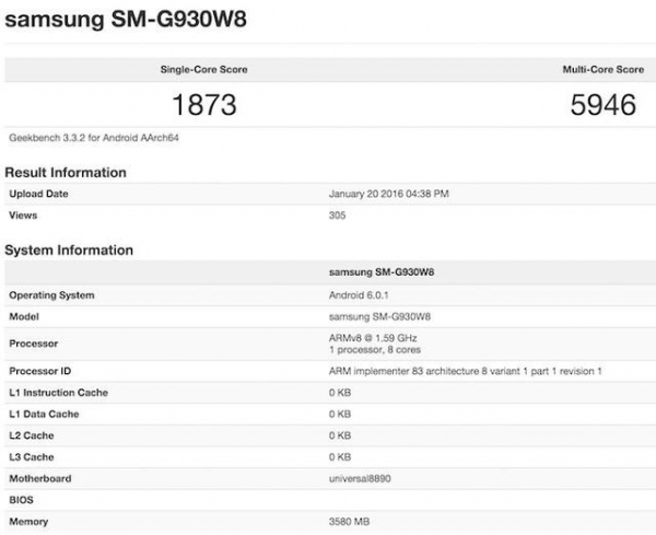 不过,这未必是Exynos 8890处理器将来的实际性能表现,毕竟现在上传到跑分网站上的数据应该都是测试版本,并且在去年12月30日的时候,还有三星GALAXY S7的国行版本SM-G9300同样有过跑分成绩出现,但从主板所显示的信息来看,似乎搭载的是Exynos7420处理器,并且内存容量也只有3GB。因此,预计随着发布时间的临近,预计在将来还会有Exynos 8890处理器机型的跑分成绩被陆续曝光。