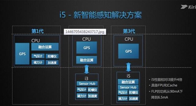 除了大核+小核之外,麒麟950的协处理器也从之前的i3协处理器(Cortex-M3架构)升级到了i5(Cortex-M7架构)。而这颗i5协处理器可以与大核A72、小核A53进行协同资源共享,由手机主系统进行智能调度。