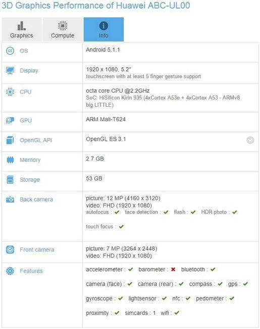 腾讯数码讯 (水蓝)尽管华为Mate 8是最近大家关注的焦点,但面对众多对手凶猛的进攻,华为还是准备推出更多的中低端机型来迎接挑战。日前,知名跑分网站Gfxbench上便出现了一款型号为ABC-UL00的华为新机,不仅配有5.2英寸触控屏和麒麟935处理器,而且还提供了3GB RAM+64GB ROM的存储组合,传闻将作为荣耀5X的后续机型推出。