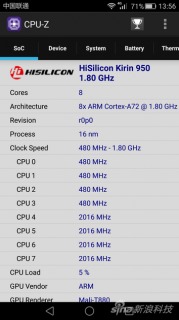 麒麟950采用了big.LITTLE大小核搭配组合,内建4颗Cortex-A72和4颗Cortex-A53,组成八核心架构。而GPU也升级为ARM最新的Mali-T880 MP4,图形生成能力比麒麟930提升了1倍。