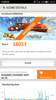图形性能方面,在GFXBench 4.0版本下,HUAWEI Mate 8的1080p曼哈顿离屏和霸王龙离屏测试结果分别为17Fps和38Fps,与苹果A9、三星Exynos 7420和骁龙810等芯片还是有些差距,不过比上代的麒麟930芯片提升明显。而3DMark测试中,华为Mate 8在Ice Storm Unlimited场景下得分为18051,比iPhone 6稍高,与今年的iPhone 6s有不小的差距。