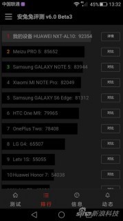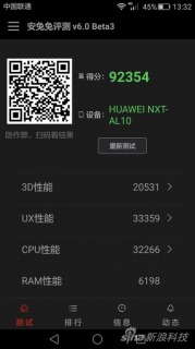 说完了空洞的参数,实际表现还是需要用跑分来检验。我们手上拿到的是4GB RAM和64GB ROM版本的Mate 8,在最新的安兔兔6.0版本下,跑分高达92354分,超过三星Exynos 7420和高通骁龙810等目前高端芯片。