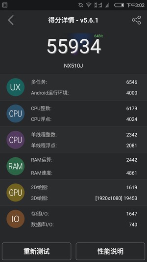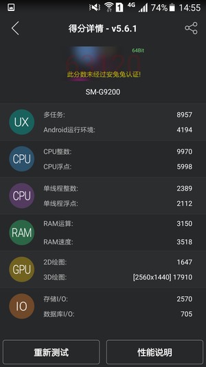 麒麟950安兔兔的各个得分项,CPU整数、浮点成绩分别是15075、8923,而CPU的单线程整数和单线程浮点为3084和3060,这些成绩都远超骁龙810和三星三星7420 。