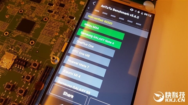 从我们现场记者发回的图片看,麒麟950在安兔兔v5.6.2版本下,跑分居然突破8万分,达到了82220的分数,着实彪悍,作为对比,跑分小王子三星7420目前的成绩在6万分左右。