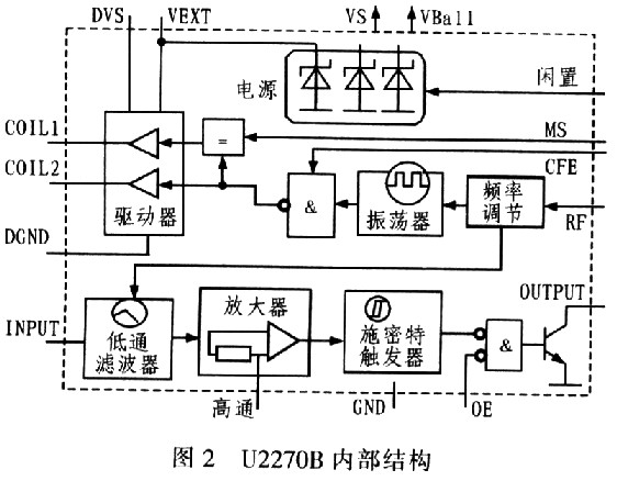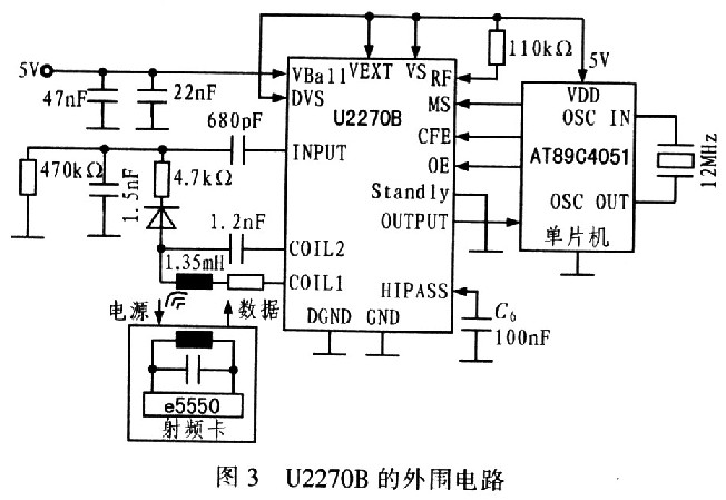 U2270B是ATMEL公司生产的基站器件,是一个对IC卡进行读写操作的非接触式工作基站,内部由振荡器、天线驱动器、电源供给电路、频率调节电路、低通滤波电路、高通滤波电路、输出控制电路等部分组成。