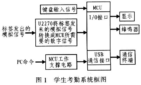 通过点名、磁卡和接触式IC卡等方式对学生的到课情况进行考勤、记录管理,既耗时又容易相互干扰;而非接触式RFID学生考勤系统实现了利用无线射频识别技术对学生考勤管理,既方便快捷,又省时。学生考勤系统由应答器和阅读器组成,其中应答器由标签(即卡片)构成,阅读器(读卡器)由射频卡基站器件U2270B及其支撑电路、主控器件MCU及其支撑电路和外围接口电路(键盘、液晶、时钟和串口模块)构成,如图1所示。