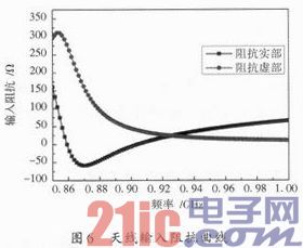 图6为该天线的阻抗曲线,可以看到在900 MHz时天线的阻抗为(44.24-j5.96)Ω,需要选择阻抗值为(44.24+i5.96)Ω的芯片与天线进行共轭匹配。如果使用的芯片阻抗值不是(44.24+j5.96)Ω而是其他的容性值,可以通过调整天线的开槽长度来优化其阻抗值以达到天线与芯片之间的共轭匹配。