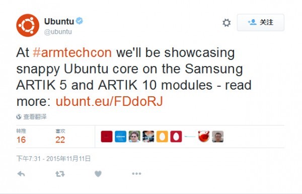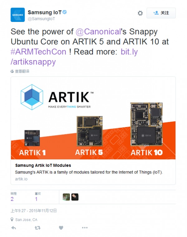 Canonical 和三星将共同参展ARM TechCon,展示了Ubuntu Core系统和三星Artik 5/10型号融合的巨大发展前景。两家公司的相关演示已经证明两家公司软硬件的合作能够为物联网设备搭建易用的开发平台,减少开发者的学习成本和并缩短产品成熟周期。