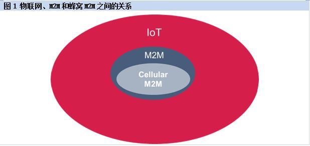 图1阐释了物联网、M2M和蜂窝M2M如何互相重叠。大小不会扩展,但插图显示出M2M是物联网的一个子集, 而蜂窝M2M又是M2M的一个子集。