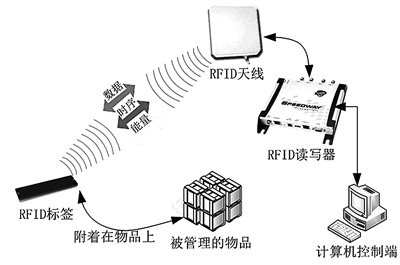 射频识别技术的核心设备由电子标签、读写器和管理平台等部分组成。电子标签是物品的标识信息,像身份证一样标注在物品表面,供读写器来识别。读写器通过接口通信协议与电子标签进行数据交换,汇集到管理平台,实现数据采集、处理、集成、存储及利用。在射频识别中,附着有电子标签的物品只要进入读写器的覆盖范围,就能从读写器发出的射频信号中获得能量,自动向读写器发送存储在芯片中的产品信息。读写器接收到物品上电子标签的信息并解码后,发送至管理平台进行有关数据处理,实现物品信息的自动识别、登记、处理,提高信息化管理水平。