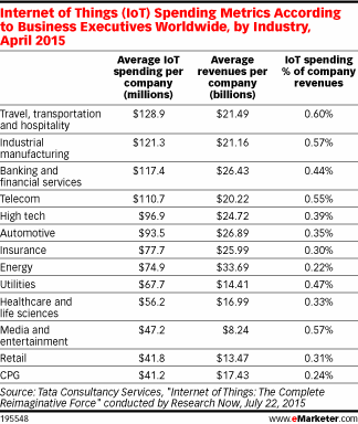 根据Tata Consultancy Services于2015年4月的研究,旅游行业在物联网上的平均花费最高。