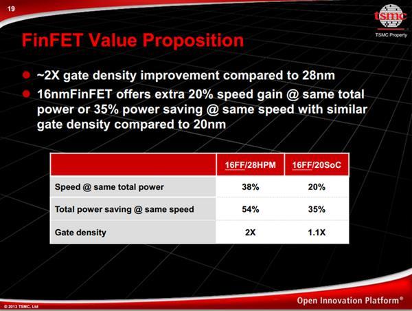对半导体芯片来说,升级工艺通常意味着晶体管性能提升、功耗下降,同时晶体管密度大幅提升。具体到TSMC的16nm工艺,该公司此前表示其16nm工艺的晶体管密度是28nm HPM工艺的2倍左右,同样的功耗下性能提升38%,同样的速度下功耗降低54%,对比20nm工艺则是20%速度提升、35%功耗下降。