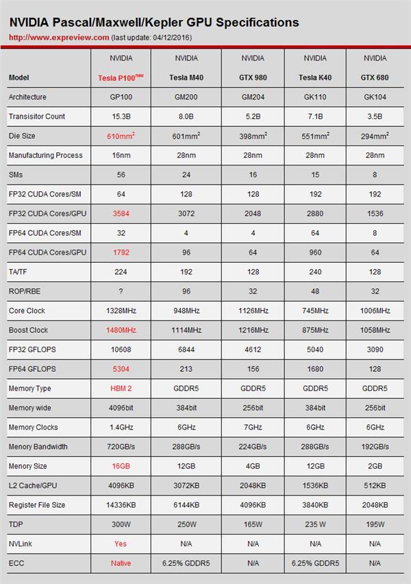 这份规格表内容非常多,初看之下会觉得手足无措,不过小编把需要重点关注的地方标红了,简单来说就是GP100核心晶体管密度再次攀升、CUDA核心大幅增加、双精度性能逆天增长、缓存/寄存器容量翻倍、HBM 2显存及NVLink总线,这几点基本上能概括GP100核心的特色。