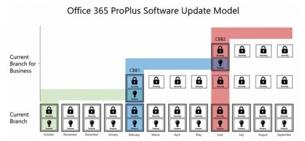 Office Current Branch消费者(家庭版和个人版)以及新的商业用户是每月最先获得Office更新和安全修复的客户。但是在Current Branch for Business(CBB)的Office 365企业用户将会以每年三次的频率获得更新和修复。