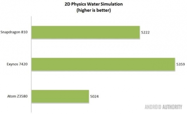 首先在安兔兔测试当中,Exynos 7420是得分最高的芯片,接下来是骁龙810,而凌动Z3580的得分还不到5万。在同级别处理器当中,只有MTK Helio X10和骁龙801的表现比它更差。虽说安兔兔的跑分水分很大,但它的确可以让我们大致了解到SoC的性能表现。在本次所进行的所有测试当中,三款芯片基本都是相同的排位:Exynos 7420第一,骁龙820第二,Z3580最差。